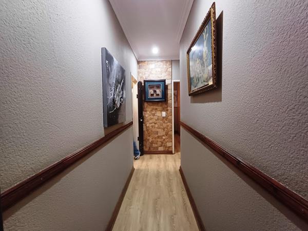 From the living area, you step into an enclosed patio with a built-in braai and a well maintained private garden