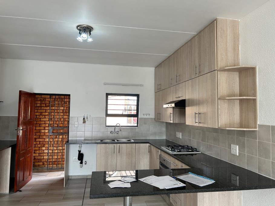 Kitchen boasting ample cupboard space and open-plan design, flowing seamlessly into the cozy lounge