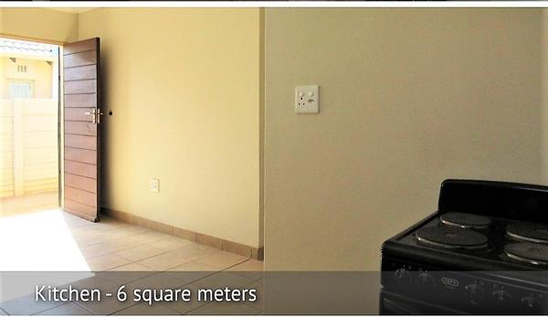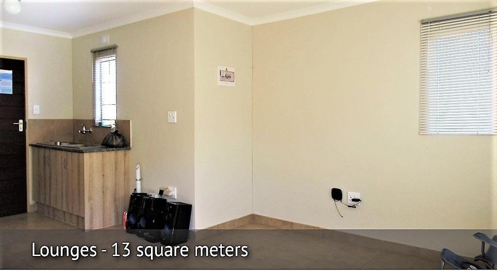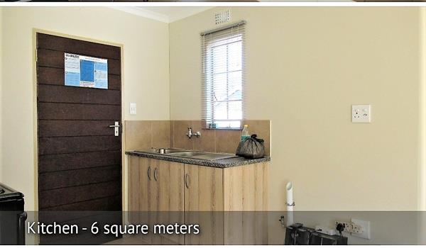 Inside, the 43 sqm floor plan is efficiently designed to maximize space. The property features an open-plan layout, integrating a comfortable lounge area with a compact kitchenette. The lounge, measuring approximately 13 square meters, benefits from neutral decor, tiled flooring, and good natural light filtering through two windows fitted with blinds. The integrated kitchenette is functional, equipped with a sink, base cabinets, a tiled backsplash, and an electric stove, catering to daily needs.