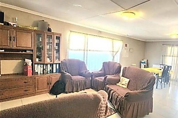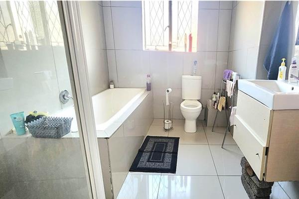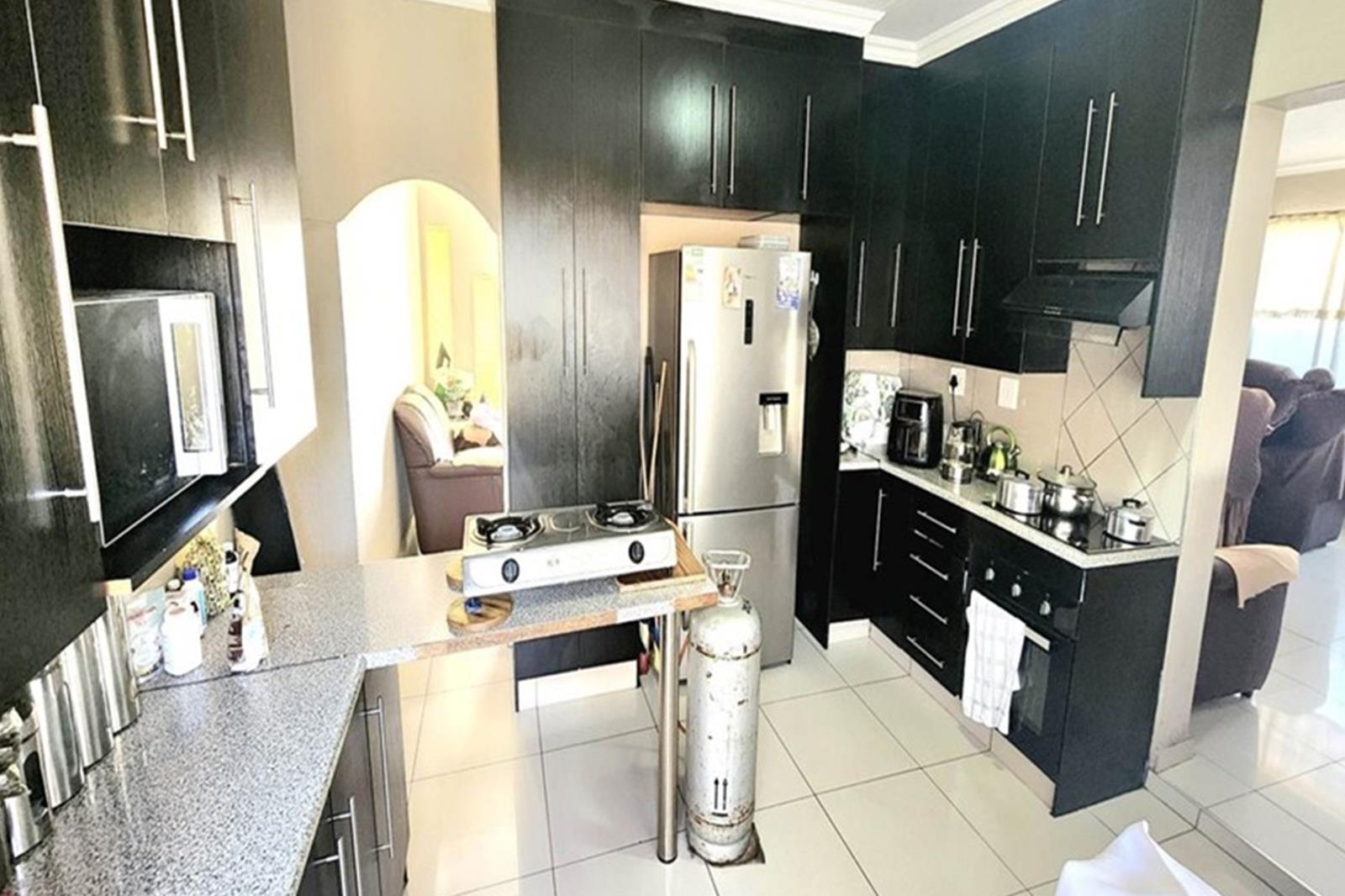 Set on a 658m2 stand, the home features a welcoming entrance hall (ideal as a study), a spacious open-plan lounge and dining room with a fitted bar, and sliding doors to a covered patio with built-in braai perfect for year-round entertaining. The modern kitchen offers ample cupboard space, a breakfast nook, electric stove, under-counter oven, extractor fan, and washing machine connection.