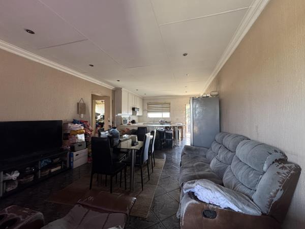 Modern open plan kitchen, dining area, and lounge leading to a sunny balcony