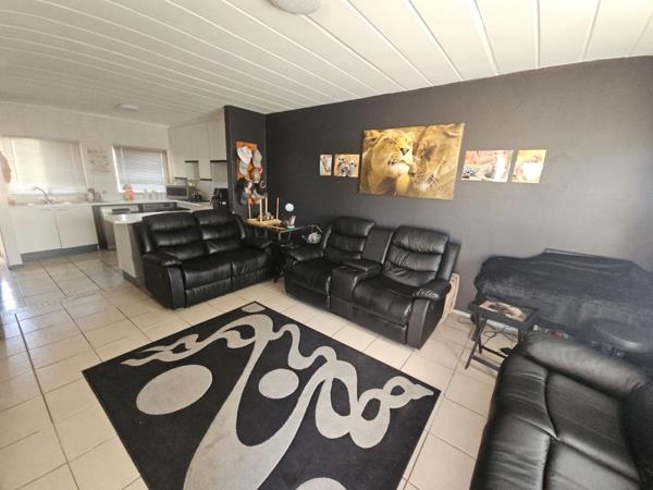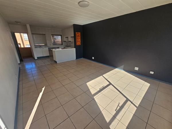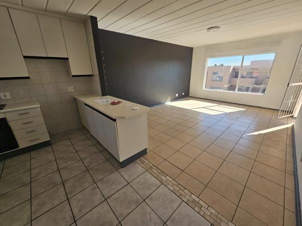 Large open plan Lounge and Kitchen. Lounge opening onto tiled balcony overlooking pool area.