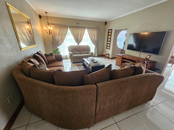 Outdoor living is a delight, with a large covered patio overlooking a sparkling swimming pool and a beautifully maintained garden. A built-in braai makes it perfect for entertaining family and friends.