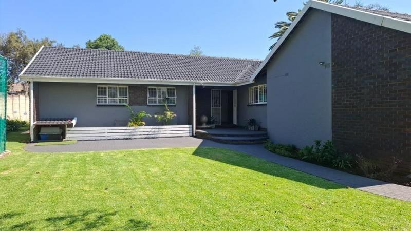 Outdoor living is catered for with a private swimming pool, a lapa, and a built-in braai, ideal for entertaining and relaxation within the established garden. The exterior showcases a modern aesthetic with a grey facade, dark brick accents, and a well-maintained lawn, contributing to significant kerb appeal. Practical amenities include a paved driveway and two garages, providing secure parking.