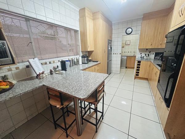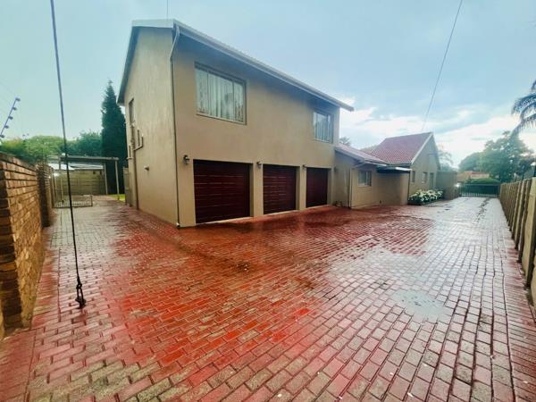 This inviting four bedroom and two bathroom family home is situated in the desirable suburban area of Randhart, Alberton. The property boasts excellent kerb appeal with a secure automated gate, electric fencing, and a paved driveway leading to three garages and two additional open parking spaces. The well-maintained front lawn and established shade tree enhance the welcoming entrance.