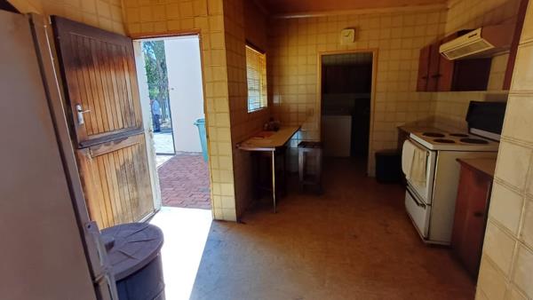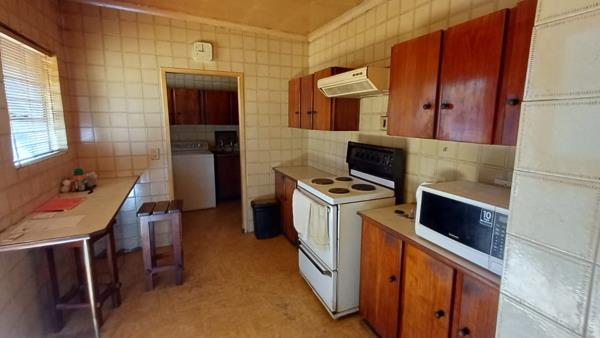 The kitchen, a central hub of any home, is functional but awaits a modern touch. It features extensive cabinetry for storage and a practical layout with an electric stove and extractor hood. Tiled walls offer durability, and a window provides natural light. Adjoining this space is a utility area, which includes laundry facilities and additional sink space, highlighting the home''s practical design. The current aesthetic, with its older appliances and finishes, offers a clear path for a complete overhaul, allowing for the installation of state-of-the-art appliances and contemporary design elements.