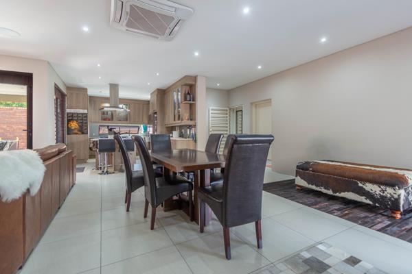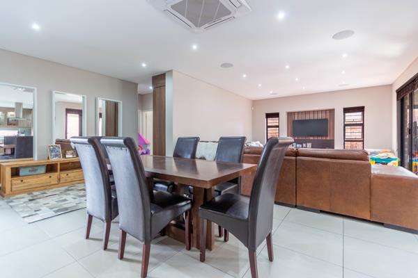 As you enter, youre greeted by an expansive, open-plan living area that exudes a sense of spaciousness and light. The space includes a sleek air conditioning system, ensuring comfort year-round. The generous dining space flows effortlessly into a modern kitchen, complete with a gas stove and high-end finishes, creating the ideal setting for family gatherings and entertaining guests. Adjacent to the kitchen is a large, inviting lounge with stacking doors that open onto a covered entertainment patio, featuring a built-in braai. Whether youre hosting a summer gathering or enjoying a cozy family night, this space is perfect for making memories.