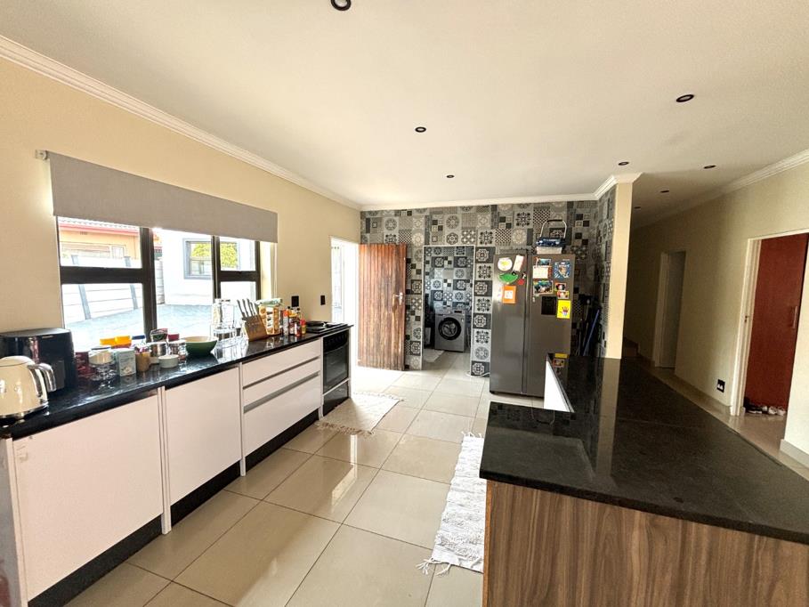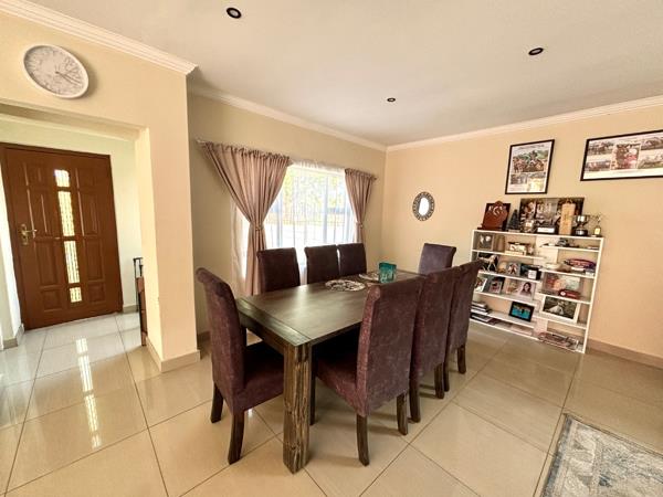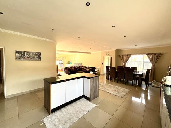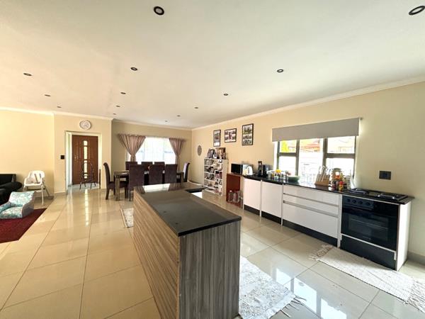Designed with an open-plan floor layout, the home features a large lounge, generous dining area and a fully fitted kitchen with granite counter tops and a separate scullery. These expansive living areas flow seamlessly together, creating an ideal space for family living and entertaining. Sliding doors from the lounge lead out to a neatly paved patio and sparkling pool- ideal for outdoor entertainment. There are three well sized bedrooms, with the main bedroom offering ample space and an open style en-suite bathroom. A full guest bathroom and a separate guest toilet provide added convenience.