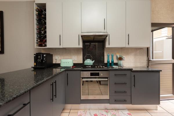 - Stylish Kitchen: Recently renovated and fitted with black granite countertops, a Whirlpool gas hob, Whirlpool under-counter oven, Defy extractor fan, and ample cupboard space including a built-in wine rack. Theres also space for two appliances, a single-door fridge (with the option to alter for a double-door), and in the court yard is a stainless-steel outdoor basin area with two private wash lines.