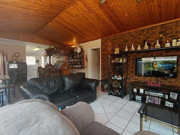 The open-plan lounge and dining area creates a warm and inviting atmosphere, enhanced by vaulted wooden ceilings and an exposed brick feature wall. Tiled flooring ensures easy maintenance, while a built-in bar makes this space ideal for entertaining. Sliding doors open seamlessly onto the covered patio, extending the living area outdoors.