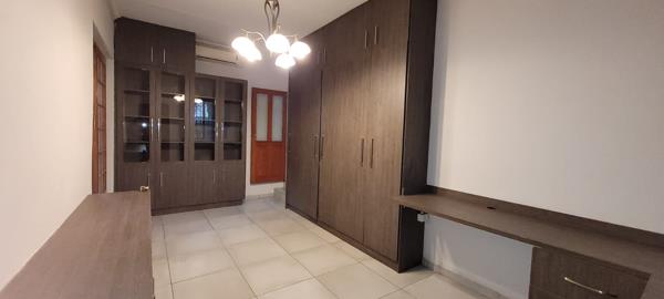 Spacious study featuring built-in cupboards, corner desk, blinds, and air conditioning