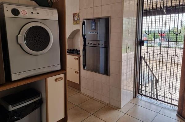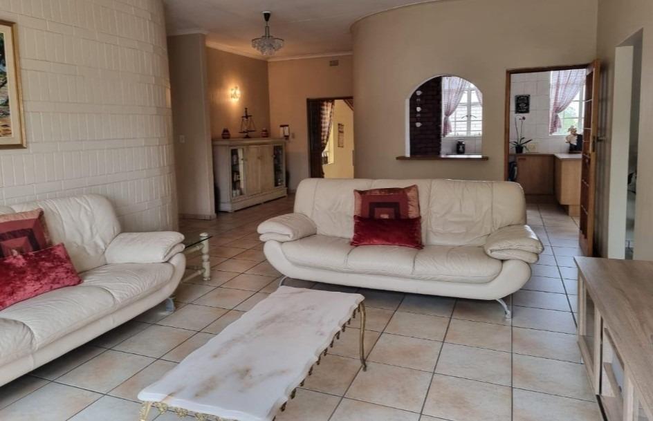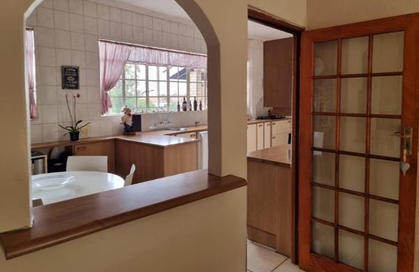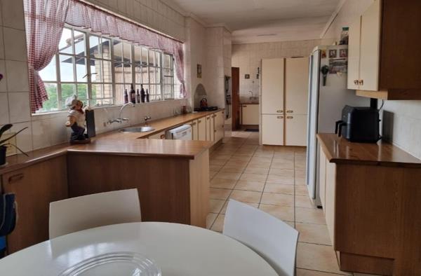 The interior features a capacious lounge area, distinguished by abundant natural light streaming through large windows and complemented by durable tiled flooring. Architectural interest is provided by a unique curved brick column and elegant arched pass-throughs, creating a seamless flow between living spaces. The property includes a dedicated dining room, perfect for formal entertaining or family meals. The kitchen is notably spacious, equipped with extensive wooden countertops, ample cabinetry, a built-in gas hob, and a double oven. It also incorporates an integrated eat-in dining area and a functional sculleryutility space with multiple sinks and provisions for laundry appliances, ensuring practical daily living.