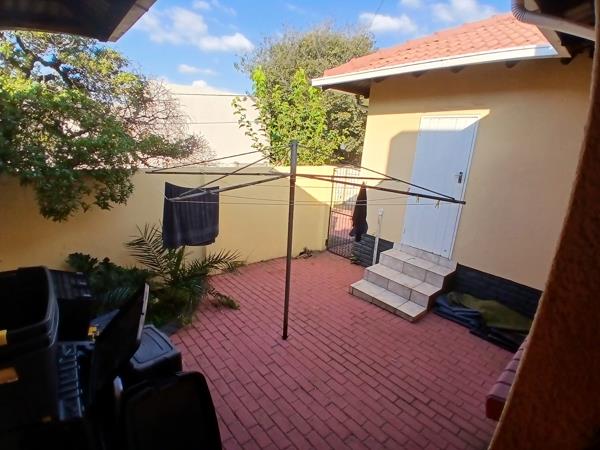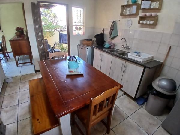 The dining room features sliding doors that open onto the backyard, creating a seamless indoor-outdoor flow. The charming farm-style kitchen is fitted with built-in cupboards, a hob, eye-level oven, and space for a dishwasher. A convenient door leads from the kitchen to a private courtyard with a washing line.