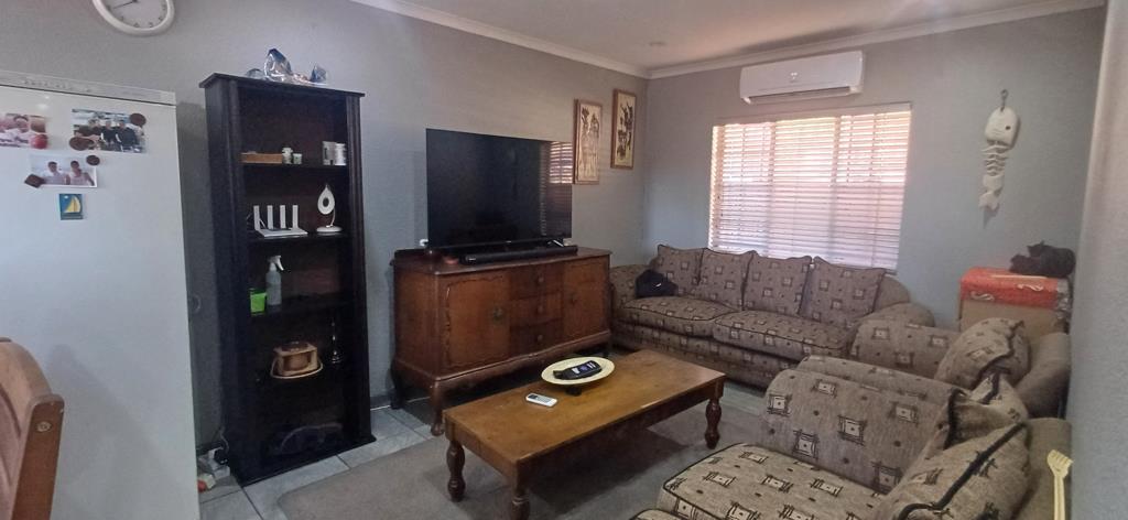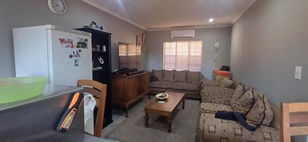Step inside to a functional layout featuring a lounge and a separate dining room, providing distinct spaces for relaxation and meals. The living areas boast neutral grey walls and durable tiled flooring, complemented by natural light from windows fitted with blinds. Air conditioning units ensure climate control, while recessed ceiling lights provide ample illumination throughout the main living spaces.