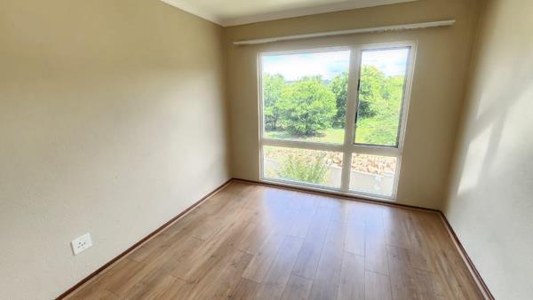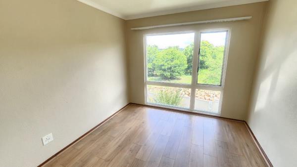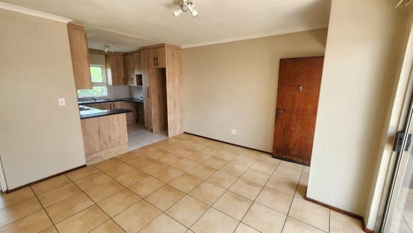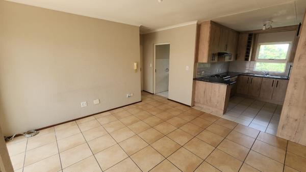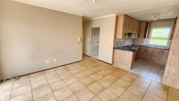 The unit welcomes you with a spacious open-plan lounge and kitchen area with tiled flooring, creating a clean and low-maintenance living space. The kitchen is fitted with modern cupboards, good counter space, and a practical layout, making it ideal for everyday use.