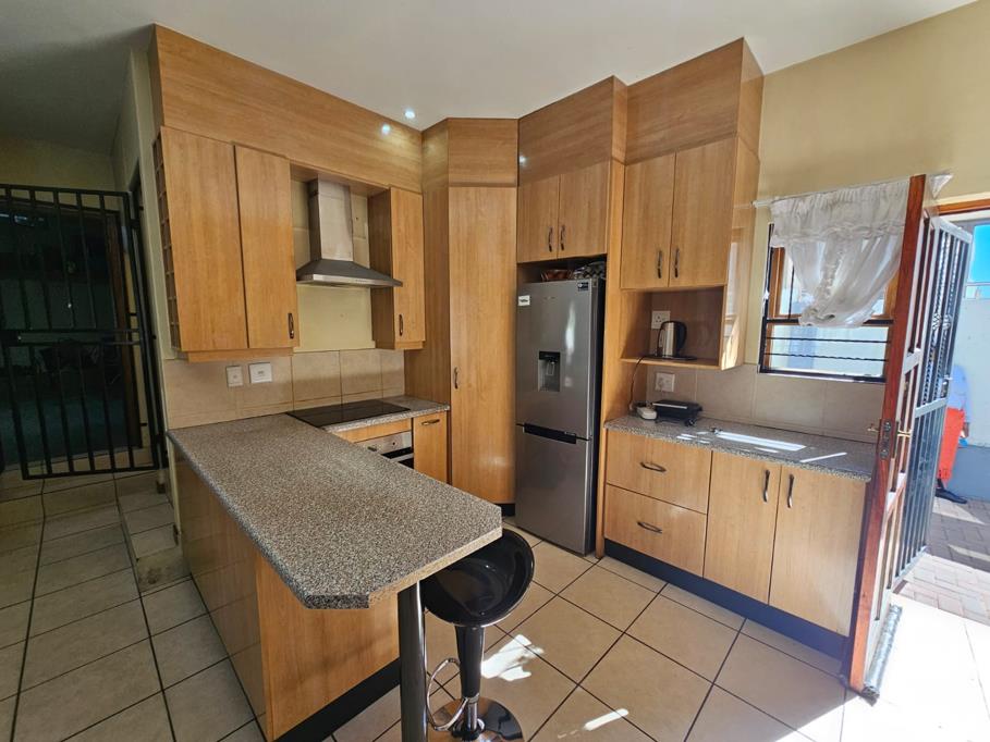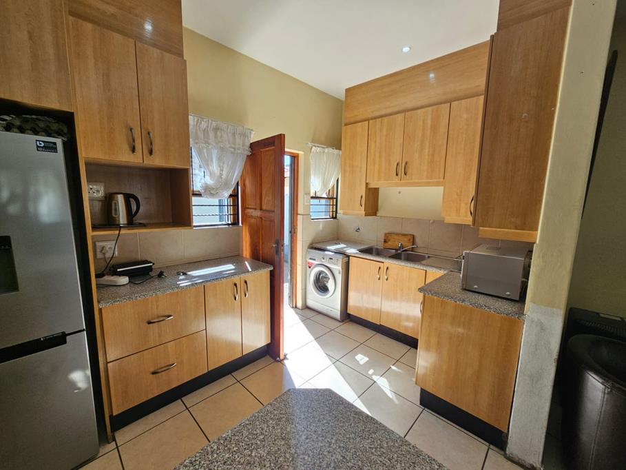 Large open plan tiled Lounge, Dining room and Kitchen. Lounge opening onto covered patio with build in braai overlooking garden.