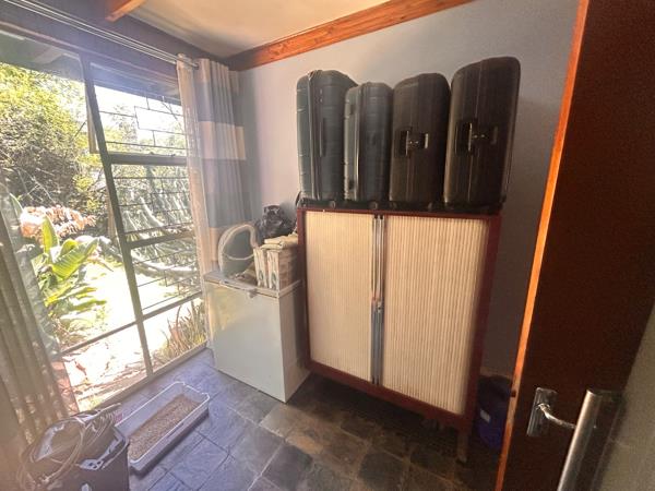 The interior layout comprises two distinct lounge areas, providing versatile spaces for relaxation and entertainment. One lounge features a striking glossy wooden panel ceiling, exposed brick walls, and a cozy fireplace, all illuminated by large windows that offer picturesque views of the lush garden. The second spacious room, currently utilised for recreation, boasts a high wooden plank ceiling, tiled flooring, and a brick accent wall, with abundant natural light streaming through its generous windows. The functional kitchen is equipped with ample counter space, white cabinetry, a double sink, a built-in oven, and a designated area for a large refrigerator. Tiled flooring extends throughout, leading to a separate, practical scullery/utility area, enhancing the home''s operational efficiency.