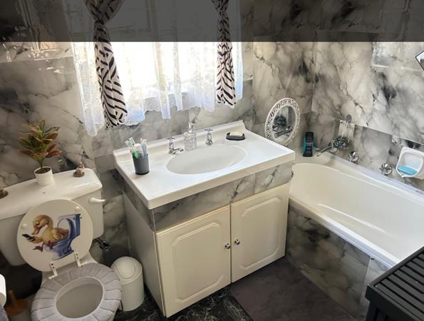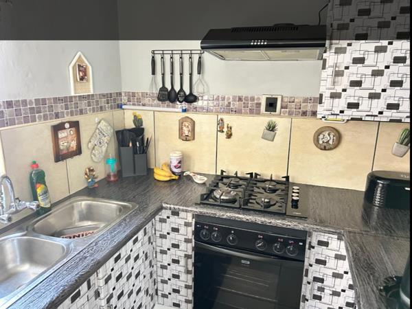 The functional L-shaped kitchen is equipped with a gas hob, oven, and extractor fan, alongside a double stainless-steel sink and ample countertop space. While compact, it offers all the essentials for daily living. The property includes two comfortable bedrooms, with one featuring a private en-suite bathroom. Both bathrooms are appointed with marble-effect wall tiling, a vanity with an integrated sink, and a bathtub, providing a clean and functional space.
