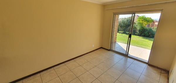 Both bedrooms are designed for comfort, with the main bedroom benefiting from ample natural light and a spacious three-door wardrobe for essential storage. The unit includes a well-appointed bathroom, catering to the needs of residents. Large sliding glass doors in the living area provide direct access to a private patio and a communal garden space, offering a tranquil outdoor retreat and views of distant hills. This indoor-outdoor flow is ideal for relaxation or entertaining.