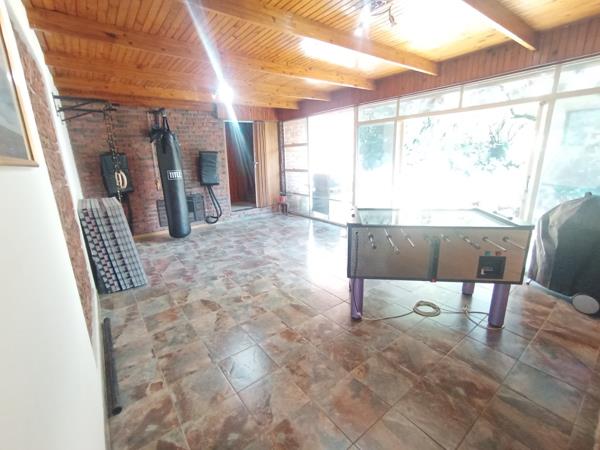 Step inside to discover an interior rich with character featuring two expansive lounges designed for both grand entertaining and intimate relaxation. The primary living areas boast striking exposed brick walls and glossy wooden slatted ceilings creating a warm lodge like ambiance. Large windows and glass doors invite abundant natural light, complementing the durable tiled flooring throughout. A substantial brick fireplace forms a captivating focal point perfect for cooler evenings. An additional versatile recreational room also with high wooden ceilings and ample light offers endless possibilities for a home gym or entertainment hub. The residence comprises five generously proportioned bedrooms providing private sanctuaries for every family member. Three well appointed bathrooms, including a luxurious onsuite ensure comfort and convenience catering to the demands of a sophisticated household. The L shaped kitchen equipped with white cabinetry, dark countertops, a built-in hob and a range hood benefits from natural light and includes a practical scullery area.