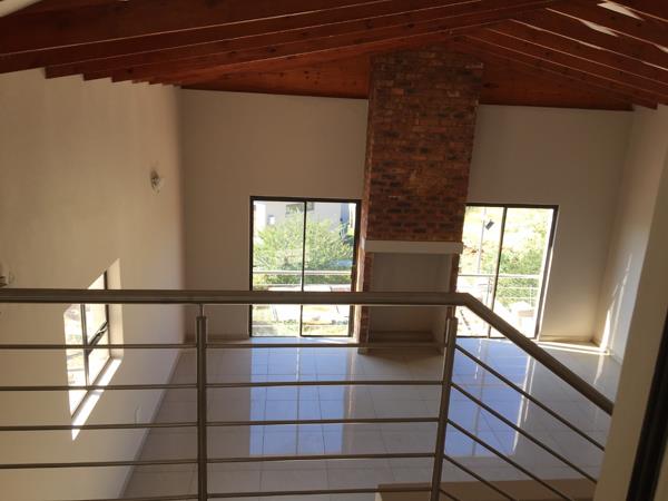 Discover this exceptional residential sale opportunity in the sought-after South Crest area of Alberton, South Africa. This modern family home offers a spacious and inviting atmosphere, characterized by its striking double-volume living areas and vaulted wooden beam ceilings that enhance the sense of grandeur and light. Abundant natural light streams through large windows, illuminating the contemporary tiled flooring and highlighting the open-plan design, perfect for modern living and entertaining. The property features two comfortable lounges and a dedicated dining room, with a prominent exposed brick chimney adding character and a focal point to the main living space. A sleek metal balustrade on the upper landing overlooks the expansive lower level, creating an impressive interior flow.
