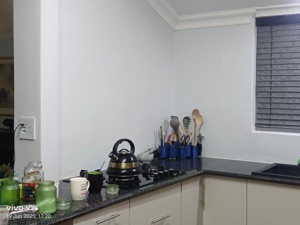 The lounge seamlessly flows through sliders to a lush garden, offering a perfect blend of indoor and outdoor living. The adjacent modern kitchen has granite countertops, an eye-level oven, a gas hob and ample cupboard space. The spacious dining room provides an ideal setting for family meals and entertaining guests.