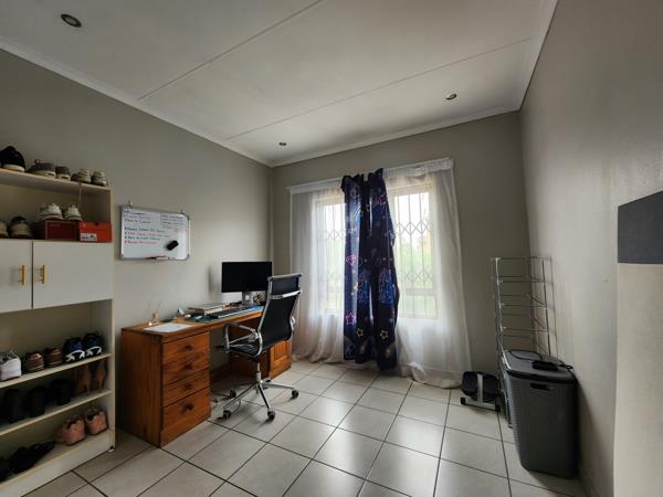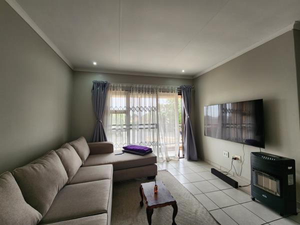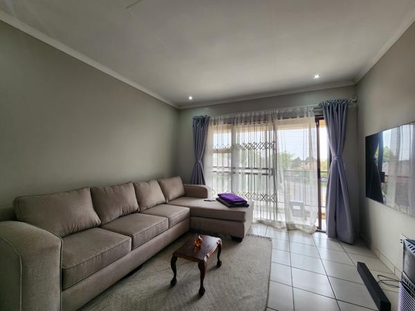 The apartment boasts two well-sized bedrooms with built-in cupboards and two bathrooms. The family bathroom is generously proportioned, featuring a bath, basin, toilet, and additional cupboard space, while the main ensuite offers a modern shower, basin, and toilet for your convenience. A linen cupboard in the passage provides extra storage.