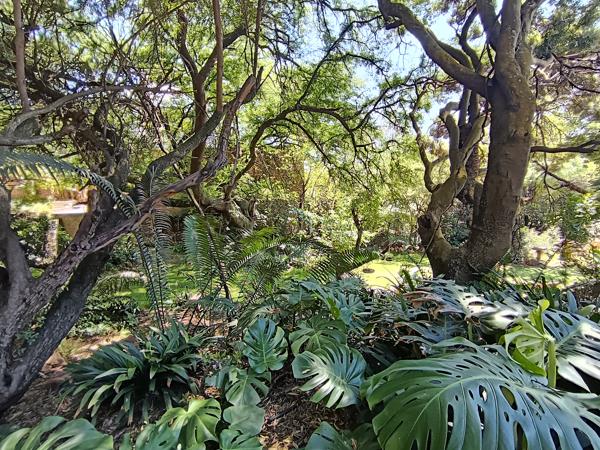 The exterior grounds are a standout feature, creating a private retreat bathed in natural light. The property sits within a very big, established garden, characterized by lush, mature trees, dense tropical foliage, and rocky elements that give it a unique, naturalistic feel.