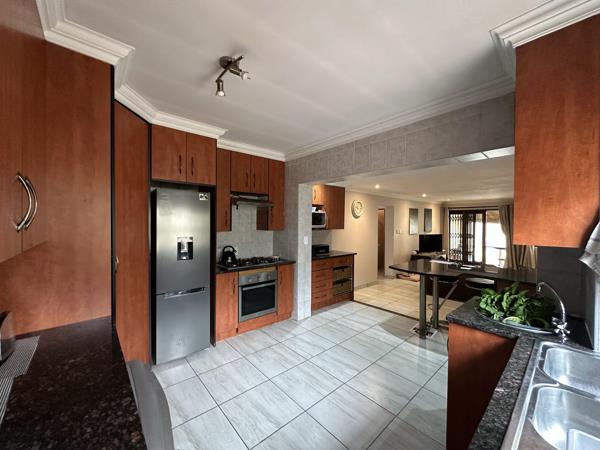 The property also includes a spacious patio with a built-in braai, a generously sized garden, a water tank, and solar power for added efficiency. Parking is ample, with a double garage and an additional carport. Close to amenities and easy access to Alberton CBD and the Netcare hospital.