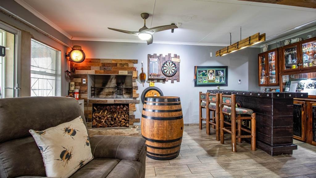 Step inside to find a welcoming lounge area featuring classic parquet flooring and a warm wood panel ceiling, complemented by a decorative fireplace. The modern kitchen is a highlight, boasting striking dark blue cabinetry, ample storage, elegant marble-effect countertops, and a gas hob, all set on stylish wood-look flooring. An open-plan design connects this space, enhancing the home''s flow. The dedicated entertainment room is a true gem, complete with a built-in braai, a fully equipped rustic bar, a darts board, and even a projector, ensuring year-round enjoyment for gatherings.
