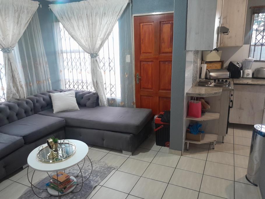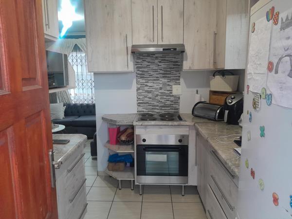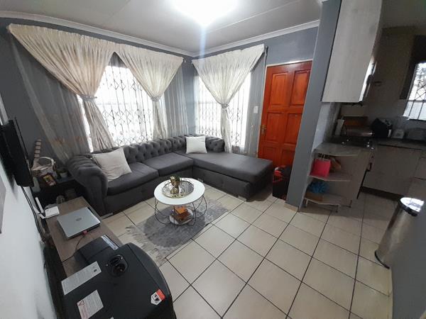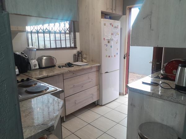 - Open-plan living area: Bright lounge with tiled flooring and large windows fitted with burglar bars and blinds. Flows directly into the kitchen, ideal for easy living.