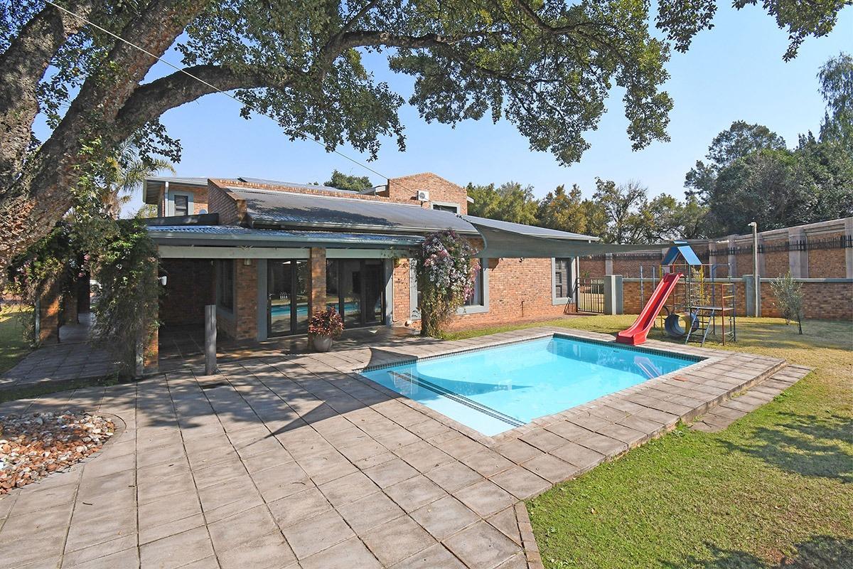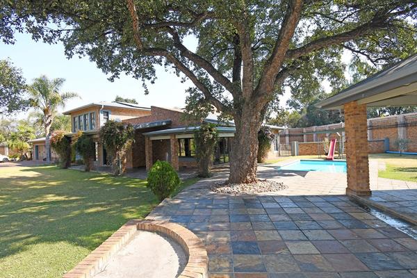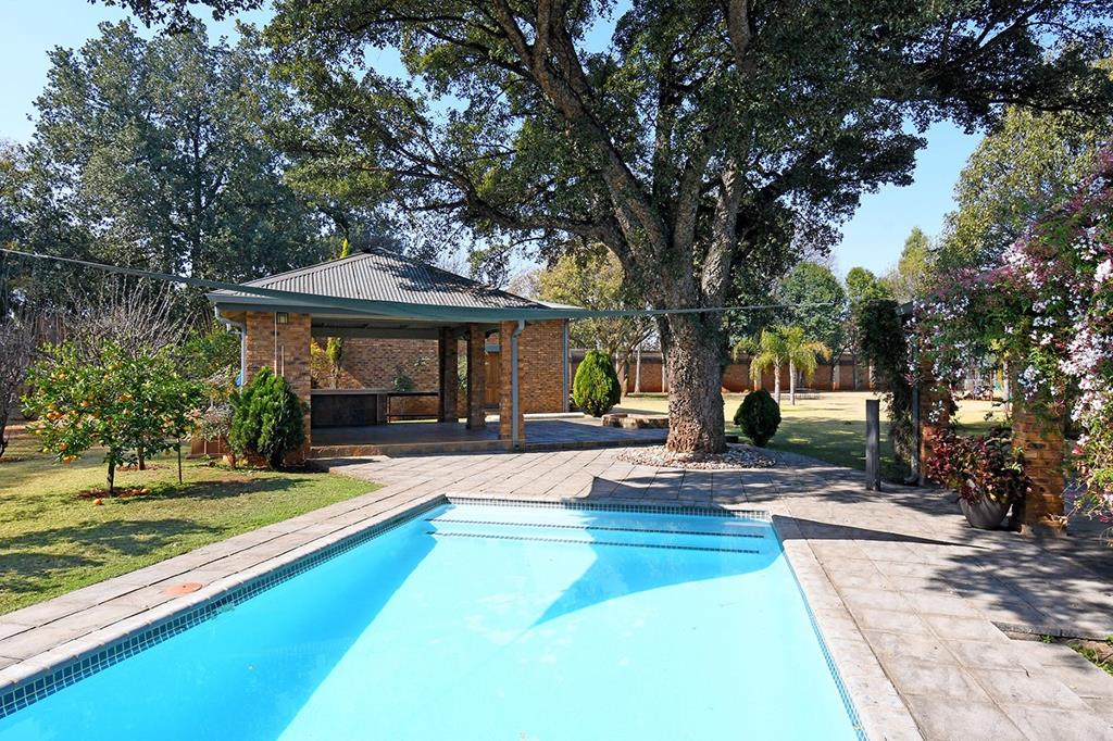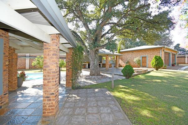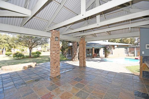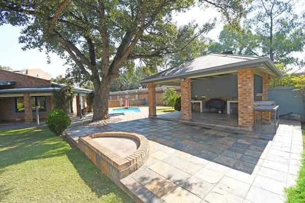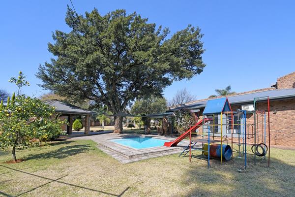 Outdoors, the property is a true oasis. A sparkling swimming pool with a heat pump is surrounded by a beautifully landscaped paradise garden, complete with palm trees, a trampoline, and a covered braai area perfect for relaxed outdoor dining. A small dam attracts exotic birdlife, including majestic silver pheasants, creating a peaceful and picturesque environment.