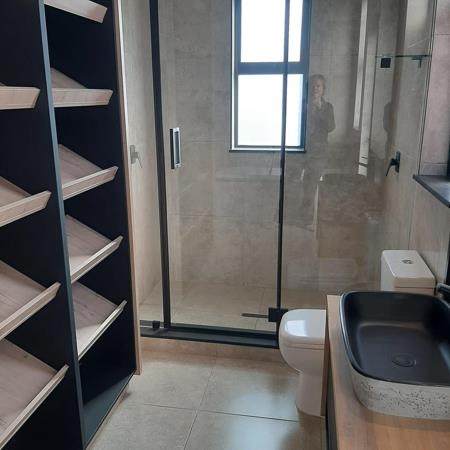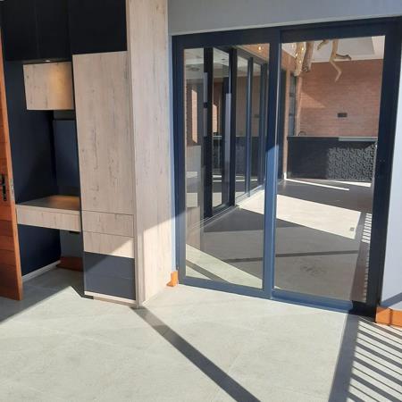The open-concept design ensures an abundance of natural light, with large aluminium sliding doors that lead onto a spacious entertainment patio. This outdoor area includes a built-in braai. The modern kitchen is both functional and beautiful, with separate scullery space for all your appliances, neatly tucked under sleek quartz countertops.