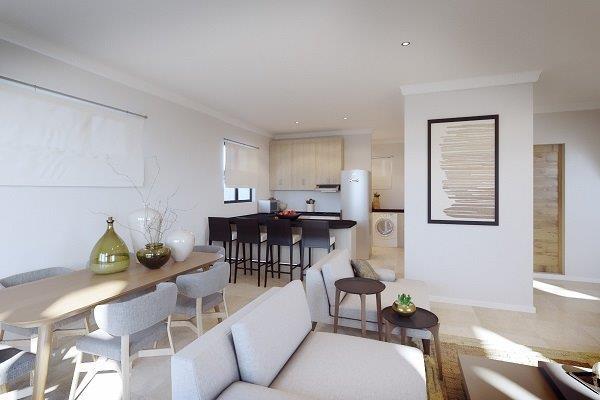 Type A1 3/0 (207 m2 double storey) 3 bedrooms, 2 bath, guest toilet, open plan kitchen, scullery, open lounge and dining room, covered patio and 2 automated garages. R3 095 000-00, including the stand