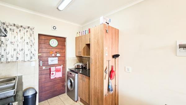 The well-appointed kitchen offers ample cupboard space, making meal prep a breeze.