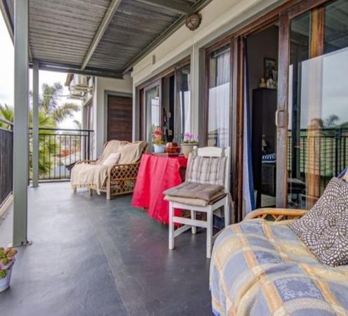 Sliding door to covered alfresco entertainment patio area complete with a pizza oven.