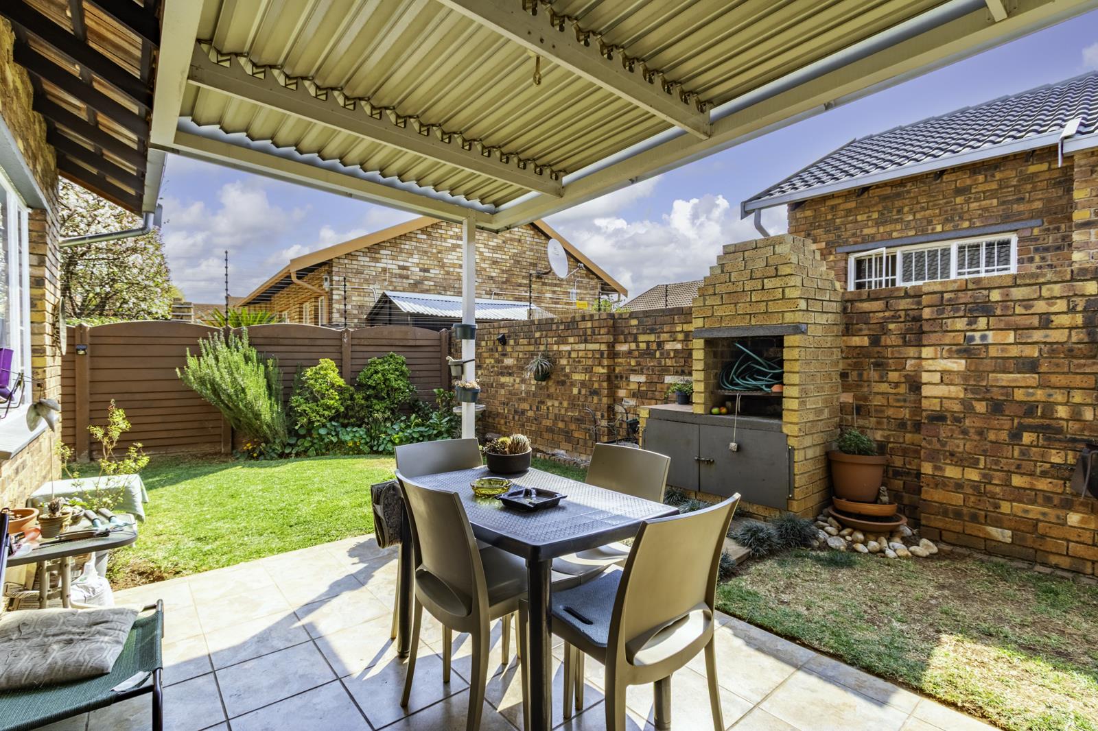Step outside to a covered patio overlooking a beautifully manicured private garden the perfect setting for morning coffee, weekend braais, or simply enjoying some quiet time outdoors.