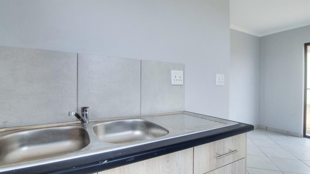 The home features two well-sized bedrooms with built-in cupboards, a neat bathroom, and an open-plan lounge and kitchen area that creates a warm and welcoming living space. The kitchen offers sufficient cupboard space and a functional layout suitable for everyday cooking and family time.