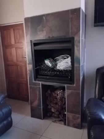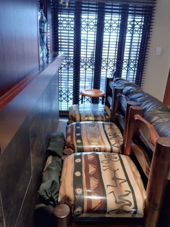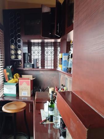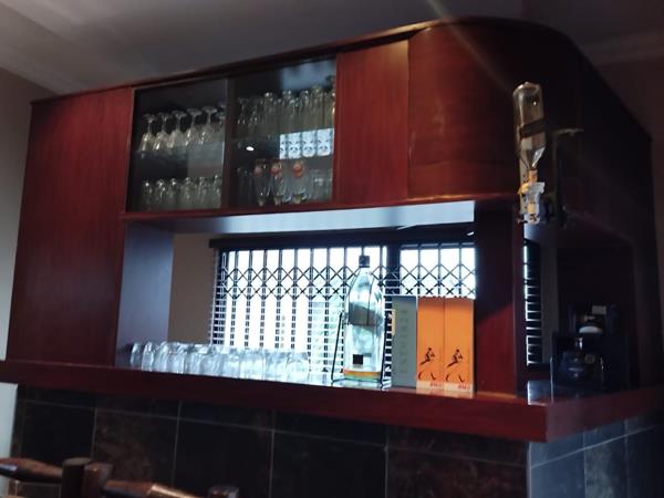 The inviting lounge includes a stylish built-in bar and flows seamlessly into a comfortable sitting room, creating the perfect setting for relaxation or hosting guests. The kitchen is thoughtfully designed with ample built-in cupboard space, a fitted stove, and a convenient table ideal for meal preparation and casual dining.