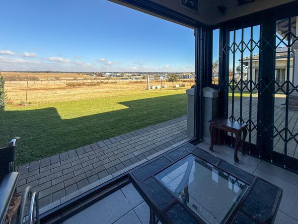 The expansive living area seamlessly flows into an enclosed patio through stacker doors, creating an inviting space to relax or entertain. Beyond, the eco estate and vast open fields offer tranquil views, enhancing the home''s appeal.