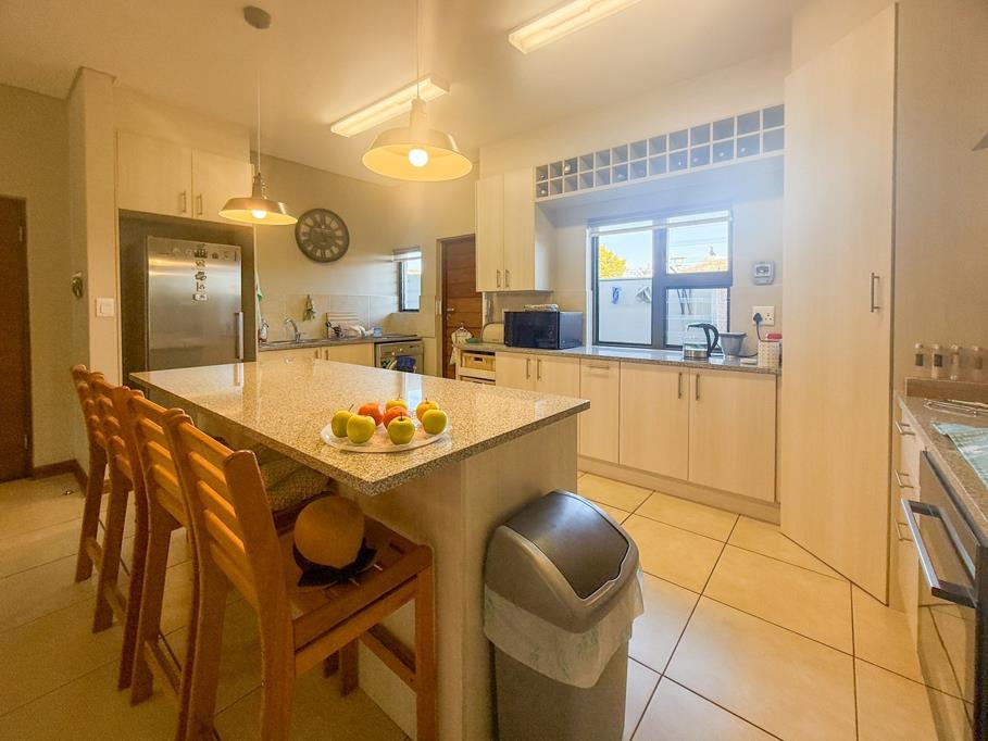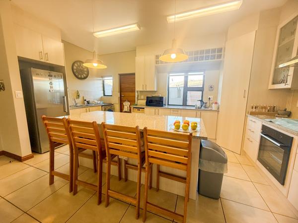 At the heart of this home is a modern open-plan kitchen with granite countertops, center island, ample cupboards, a walk in corner pantry cupboard, and plumbing for a dishwasher. The kitchen is fully equipped with a gas hob, Defy oven with thermo fan and air fryer, and extractor fan, flowing seamlessly into a generous dining area and lounge.