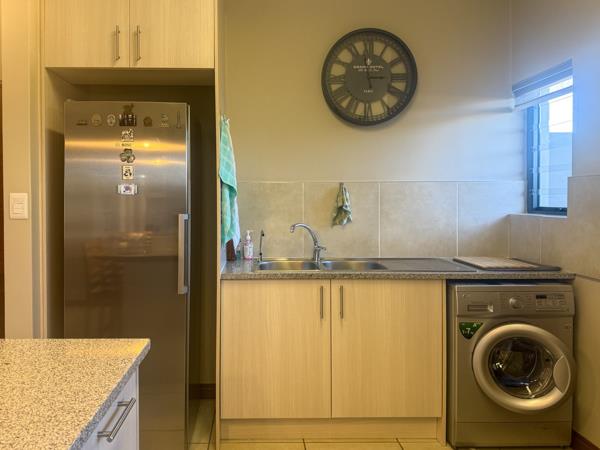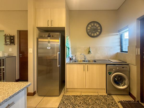 The tiled double garage includes built-in cupboards and two plumbing points, while the extra-large courtyard offers room to park a trailer or other essentials, along with a double fold-down wash line for added convenience. Gardening is a breeze with a sprinkler system and the estate garden service.