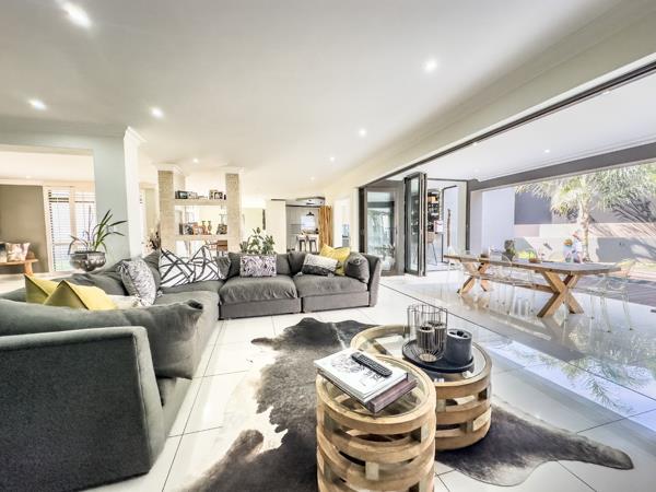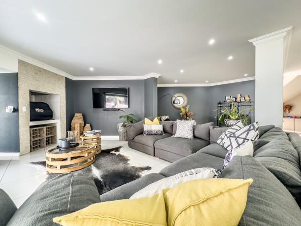 The living and dining areas are centered around a sleek double-sided built-in gas fireplace, adding both style and comfort. Expansive glass sliding doors fill the home with natural light and connect seamlessly to an indoor gas braai area, offering the perfect setting for year-round entertaining.