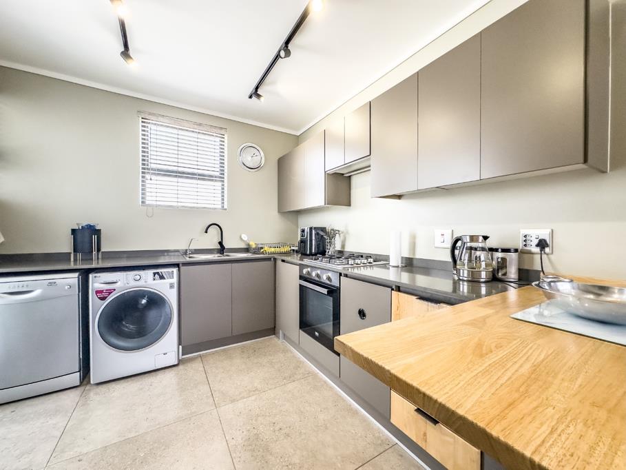 The master bedroom offers an ensuite bathroom with a bath, while the second full bathroom serves the additional bedroom and guests. The heart of the home is the open-plan living area, featuring a sleek, contemporary kitchen that seamlessly flows into the dining and living spaces.
