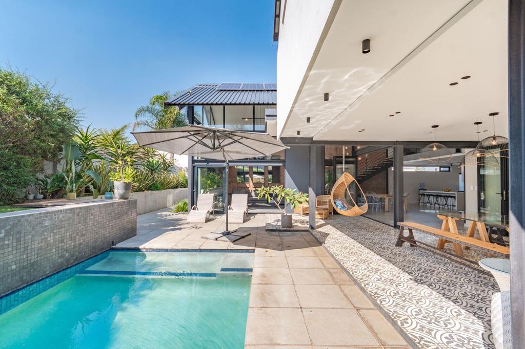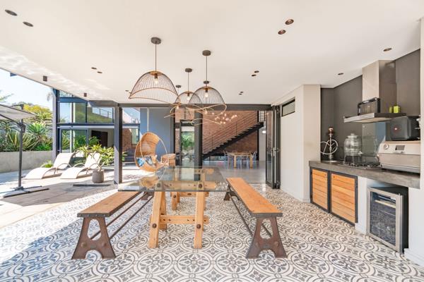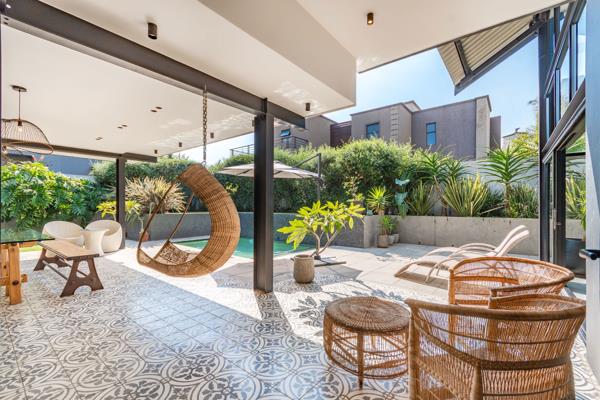 Sliding doors extend the living area onto an exquisite outdoor sanctuary. The covered patio, complete with a built-in braai, overlooks a heated pool and lush, landscaped garden an entertainers dream and the perfect escape for sun-soaked afternoons, weekend gatherings, or tranquil evenings under the stars.