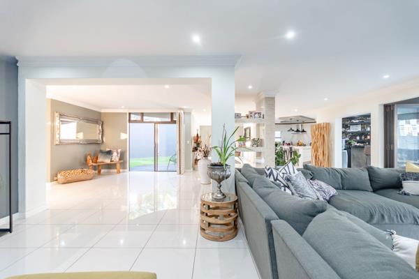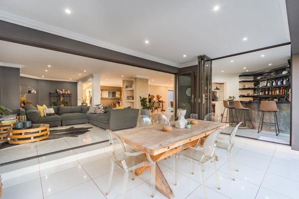 The main reception room offers indoor entertainment with a built in braai, a petite games room as well as a built-in separate bar which all open onto the deck and pool. The kitchen is well designed with a Smeg gas stove and a spacious centre island, doubling up as prep space as well as an on-the-go breakfast counter. It has state of the art built in appliances such as a Whirlpool coffee machine and microwave. The scullery offers convenience and keeps the daily mess of life out of site. It fits 3 under counter appliances and leads directly to the back courtyard which separates the wrap around garden.