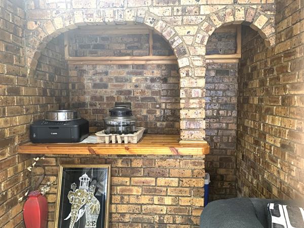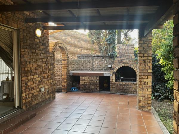 Very large TV room with electric gas fireplace and corner bar leads out onto a covered patio / braai area.
