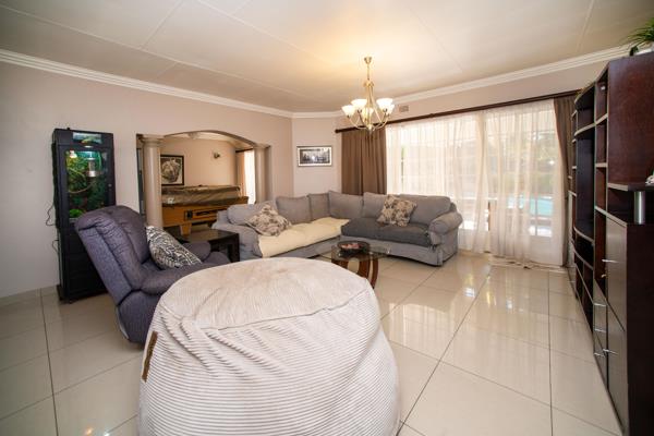 Step into the expansive open-plan living area that flows seamlessly into the dining room and modern kitchen, equipped with a gas hob perfect for those who love to cook and entertain. A separate entertainment room opens onto a covered patio, ideal for hosting gatherings or relaxing while overlooking the sparkling pool and manicured, landscaped garden.