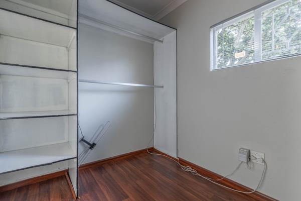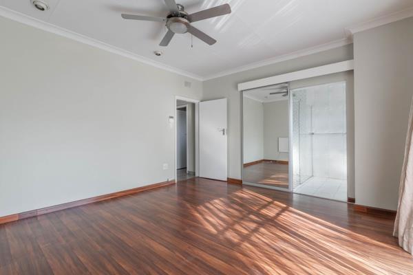 The main entrance leads directly to the homes primary bedroom wing, comprising three well-appointed bedrooms and two bathrooms. The first two bedrooms feature laminate flooring, built-in cupboards, and accommodate queen-sized beds, sharing a spacious full bathroom. The main bedroom enjoys direct access to the sunny garden via sliding doors, and includes laminate flooring, a walk-in closet, and a private en-suite bathroom with a shower.