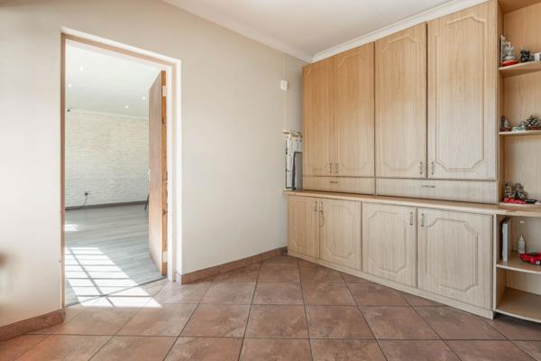 Charming Family Home with Space, Security & Great Potential. Tucked away on a quiet corner stand, this spacious family home offers loads of potential with just a little TLC. It features its own borehole, high-level security, multiple living spaces, and a great backyard for entertaining. The entrance hall leads directly to a spacious formal lounge which has access to the office and an additional lounge or playroom with built in cupboards. It also has access to the main living area.